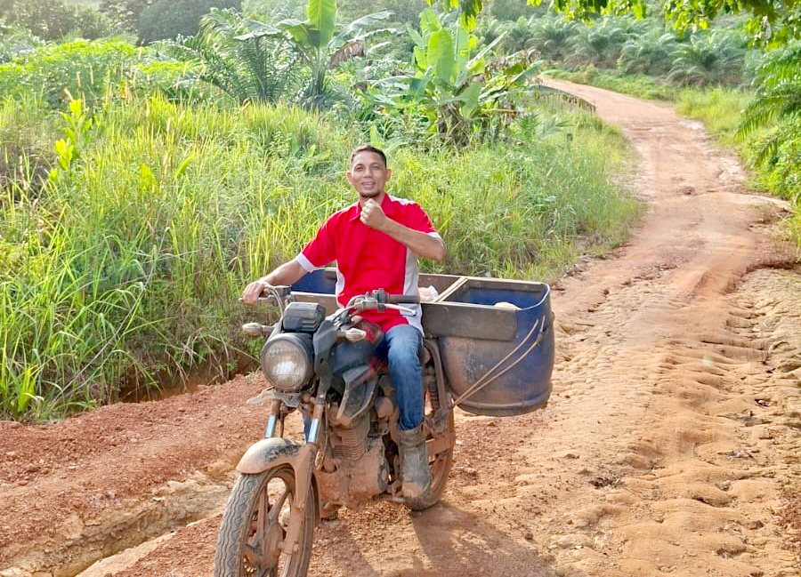 Diungkapkannya, delivery di kawasan pelosok yang jarak dari satu kampung ke kampung lain cukup berjauhan memiliki banyak tentangan. Terutama apabila musim hujan seperti saat ini. Kondisi jalan yang belum beraspal dan berada di tengah-tengah perkebunan sawit cukup licin.