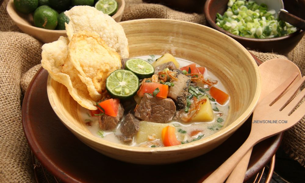 Soto Betawi terkenal dengan kuah santan atau susu yang gurih dan aroma rempah yang kuat. Dalam satu mangkuk, biasanya ada potongan daging sapi, jeroan, atau campuran keduanya, jadi rasanya lebih kaya. Kuahnya agak kental tapi tetap ringan saat disantap. Biasanya disajikan dengan emping dan acar, yang bikin rasanya lebih segar.