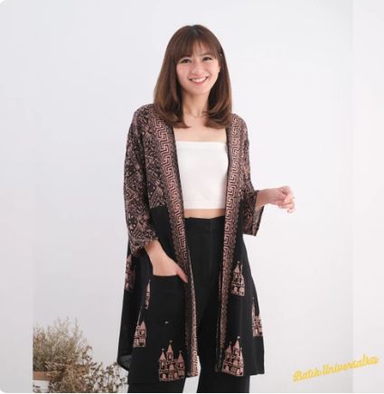 Baju batik dengan potongan kimono cocok digunakan oleh wanita di berbagai kesempatan. Umumnya, model baju batik kimono ini berbentuk outer yang simpel dan fashionable, ada yang panjang ada juga yang pendek. Baju ini juga cocok untuk digunakan oleh wanita berhijab, lho.