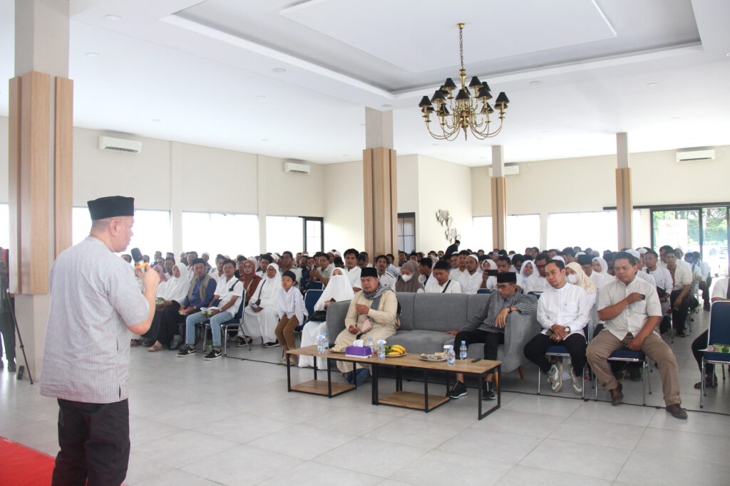 Presiden Direktur JNE M. Feriadi saat memberi sambutan kepada karyawan JNE peserta umrah di Yatuna.